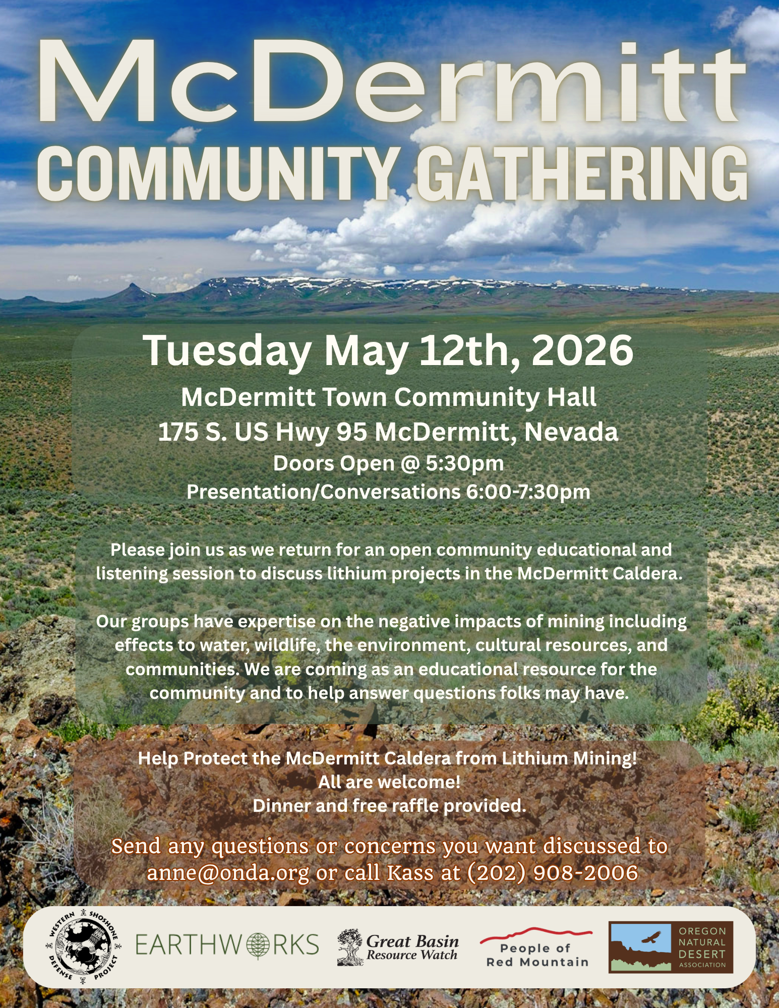 Events McDermitt Gathering April 19, 2026By Cale Christi People of Red Mountain and the Protect McDermitt Caldera Coalition will host a community gathering in McDermitt, Nevada on May 12th. All are welcome! Tagscommunity meeting Related Posts Events Klamath Community Gathering September 29, 2025 Events Community Gathering February 4, 2025 Events Protect McDermitt Caldera March 14, 2024